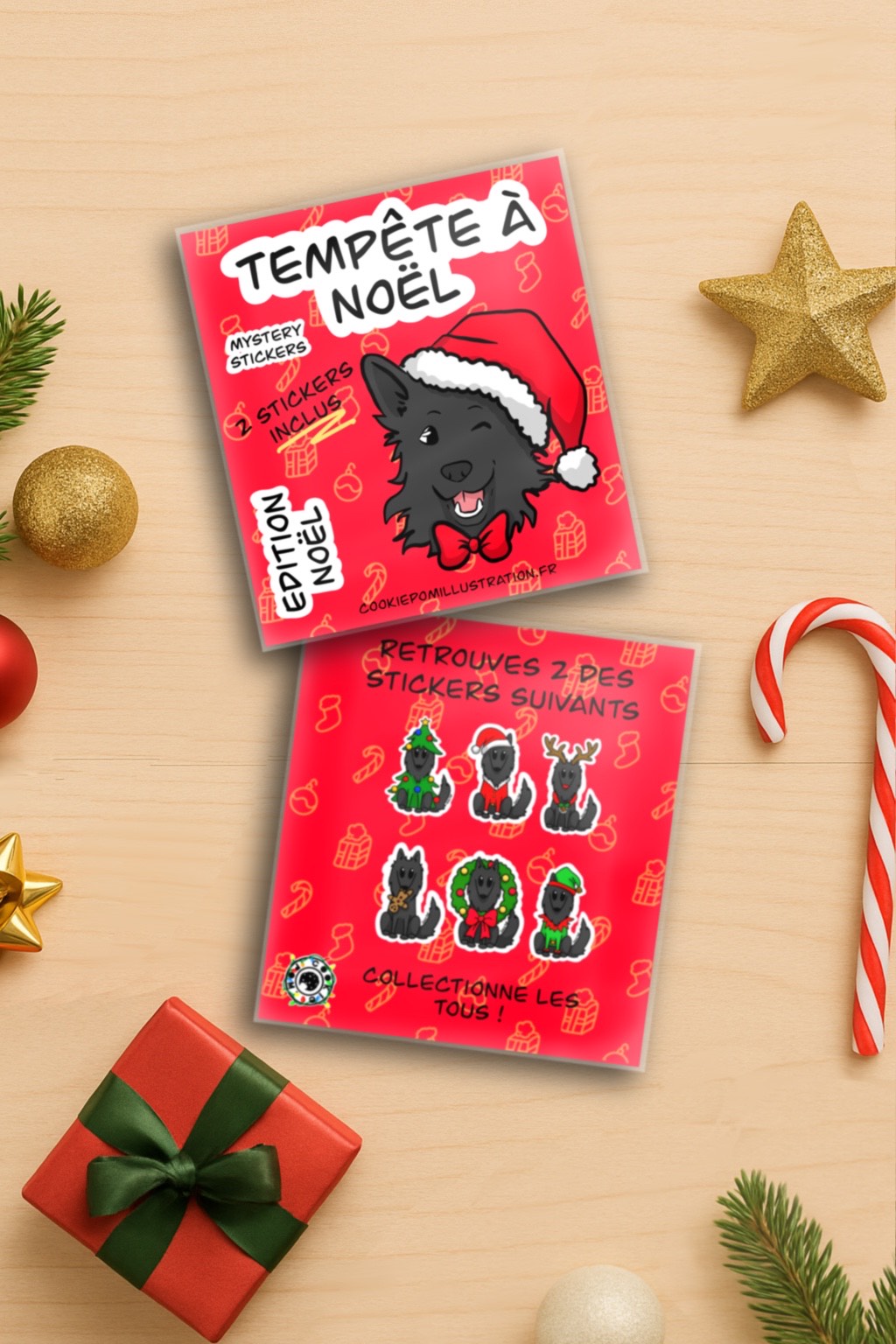 Un pack surprise contenant 2 stickers aléatoires parmi une collection exclusive de 6 illustrations de Tempête en mode Noël.